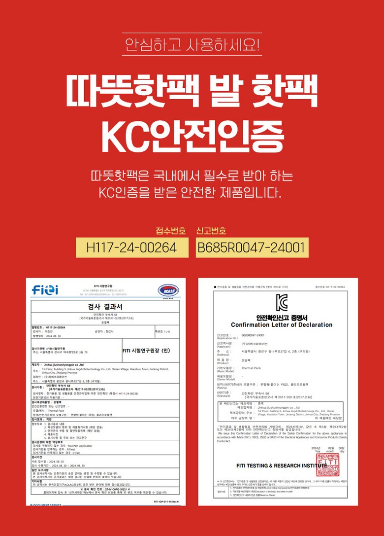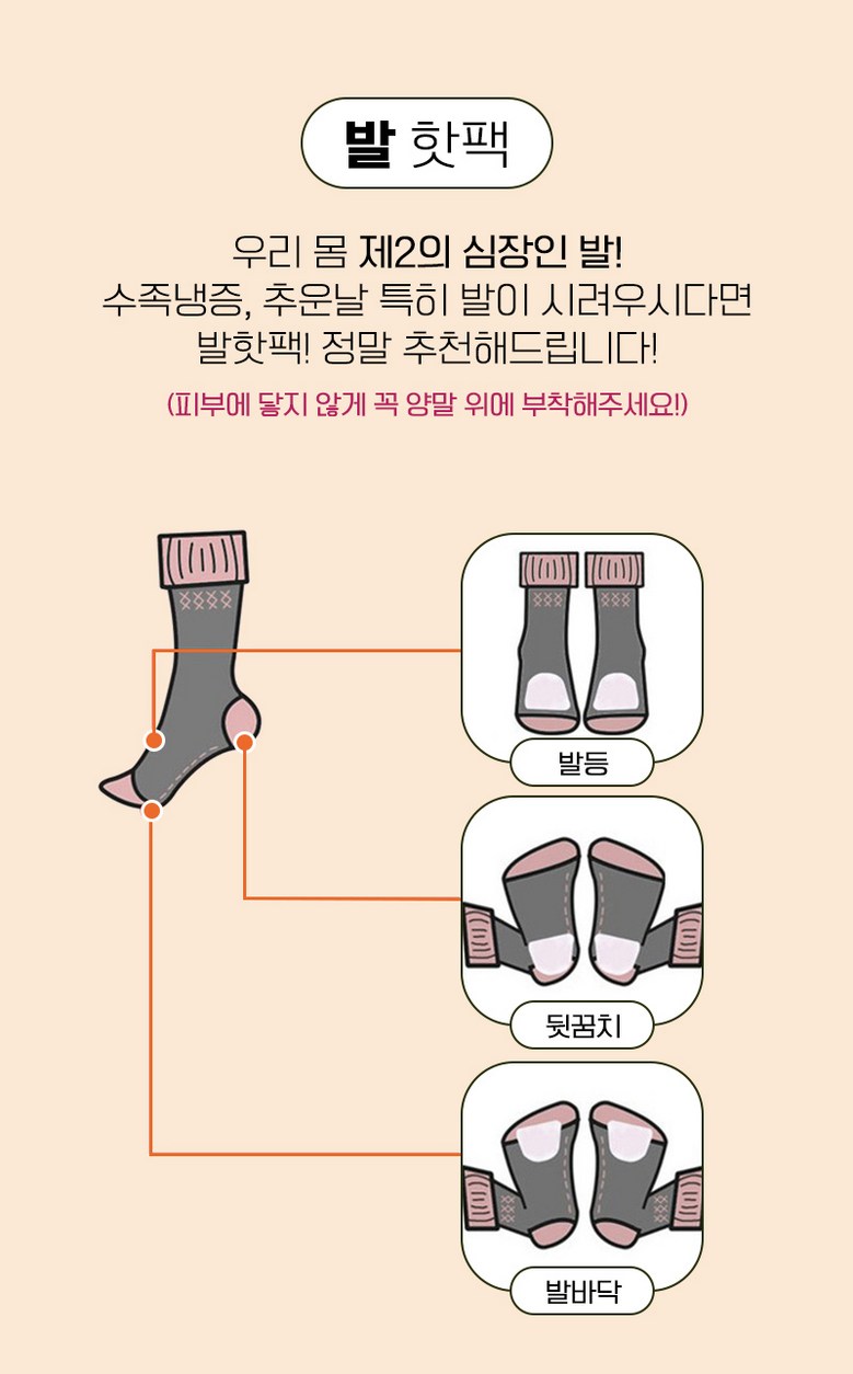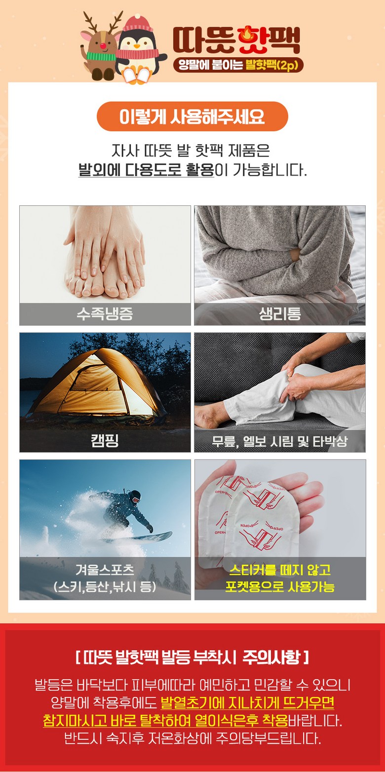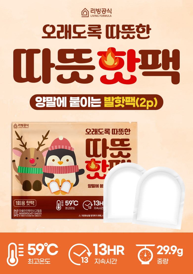 | 품명 및 모델명 | I&O 따뜻HOT팩 붙이는 발난로 핫팩(2P) | 인증/허가 사항 | KC자율안전확인신고승인필B685R0047-24001 |