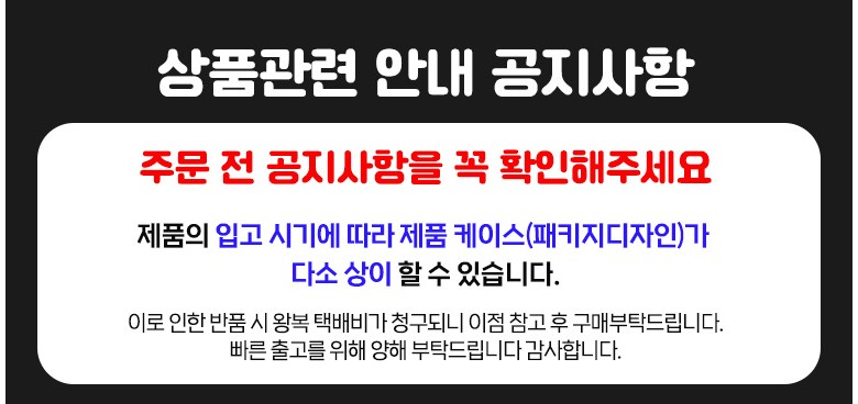 - ㆍ모니터 해상도의 차이로 인해 색상이나 이미지가 실제와 달라, 고객이 단순 변심으로 교환/반품을 무료로 요청하는 경우