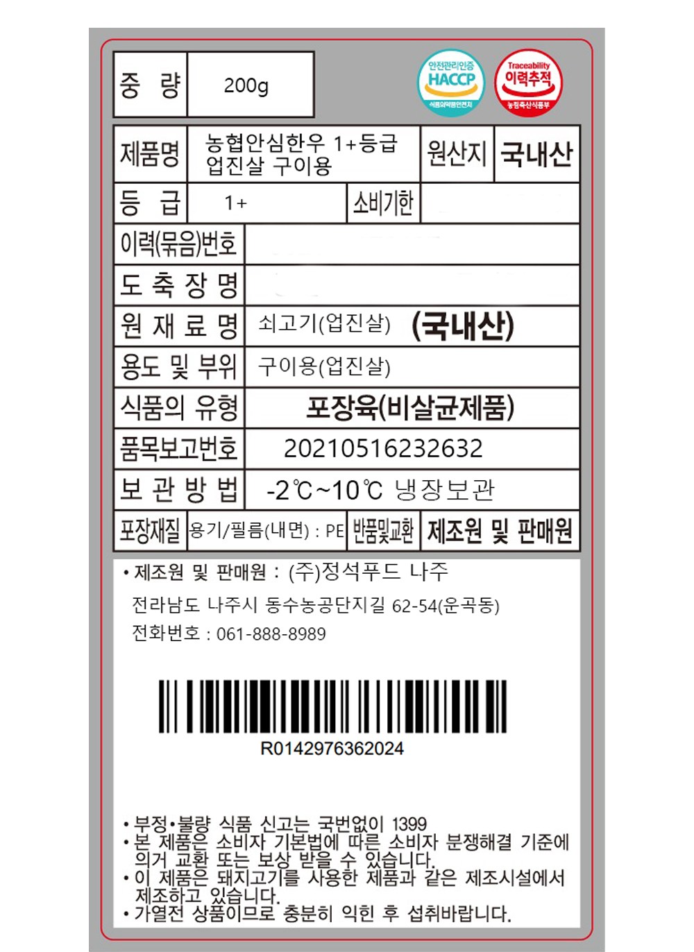 | 소비기한 또는 품질유지기한 | 소비기한(또는 유통기한) : 2026년 02월 02일 이거나 그 이후인 상품 | 세부 품목군별 표시사항 | 축산물 등급표시: 1+등급 / 이력번호 표시유무 - 이력번호 표시제품임 |