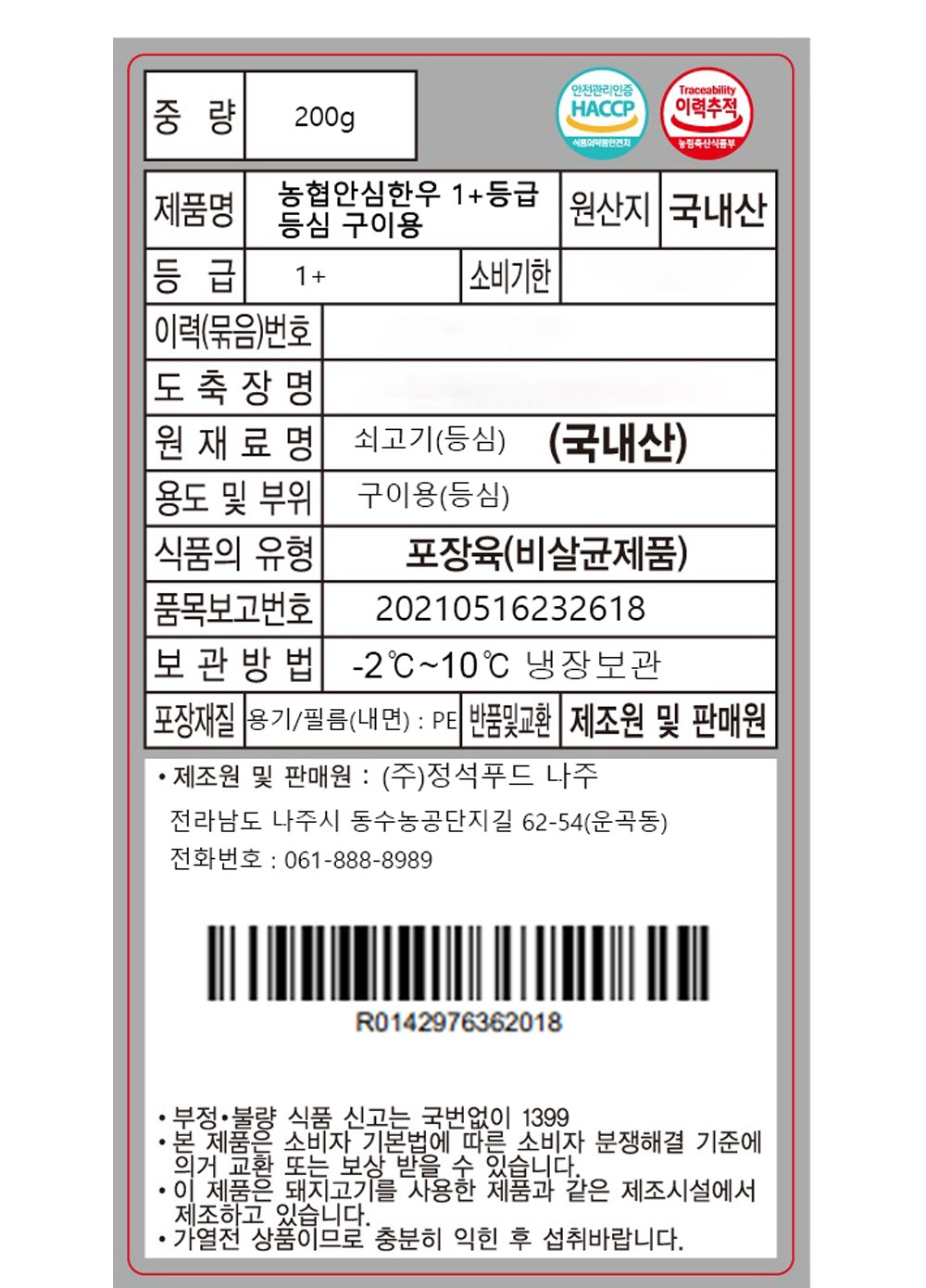 | 소비기한 또는 품질유지기한 | 소비기한(또는 유통기한) : 2025년 11월 03일 이거나 그 이후인 상품 | 세부 품목군별 표시사항 | 축산물 등급표시: 1+등급 / 이력번호 표시유무 - 이력번호 표시제품임 |