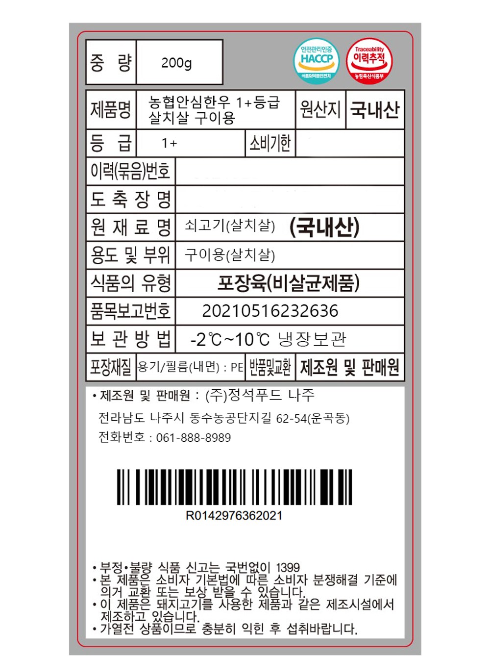 | 소비기한 또는 품질유지기한 | 소비기한(또는 유통기한) : 2026년 05월 04일 이거나 그 이후인 상품 | 세부 품목군별 표시사항 | 축산물 등급표시: 1+등급 / 이력번호 표시유무 - 이력번호 표시제품임 |