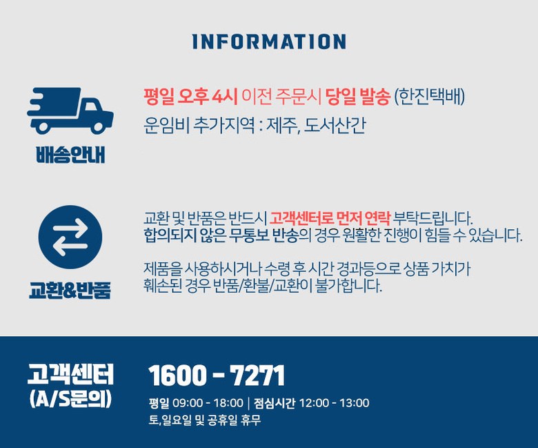 - ㆍ교환/반품에 관한 일반적인 사항은 판매자가 제시사항보다 관계법령이 우선합니다.