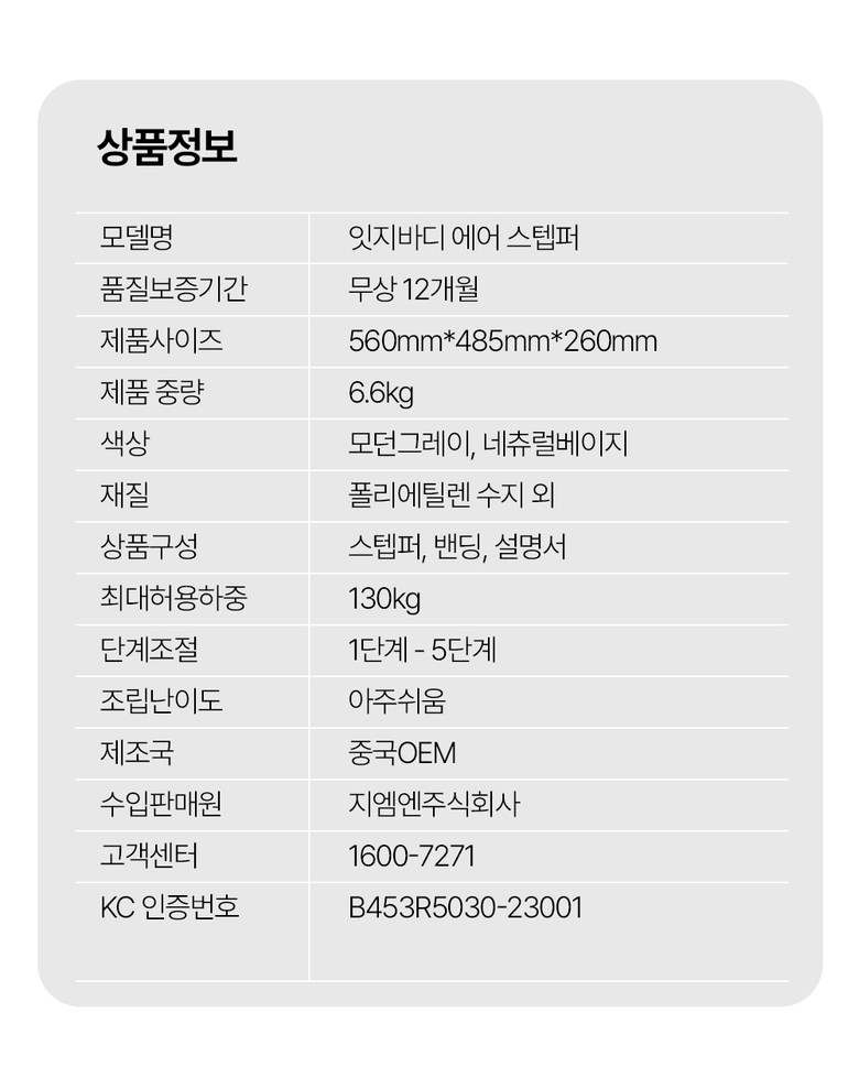 | 품명 및 모델명 | 잇지바디 스텝퍼 | 인증/허가 사항 | B453R5030-23001 |