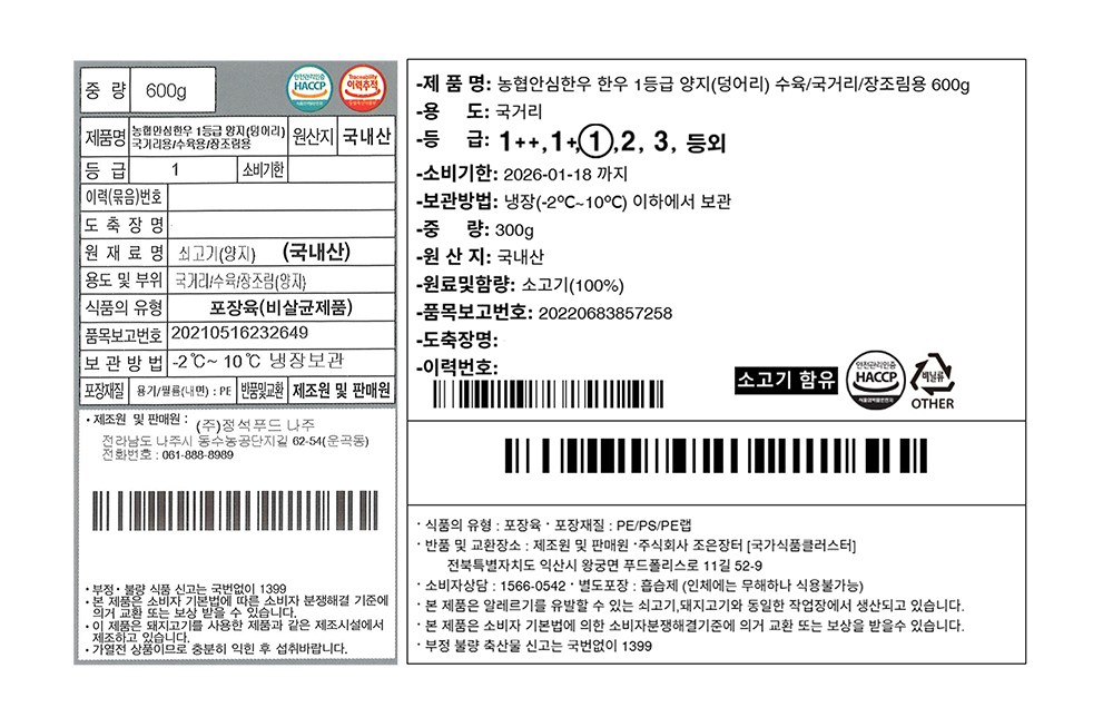 | 제조연월일, 소비기한 또는 품질유지기한 | 소비기한(또는 유통기한) : 2026년 03월 18일 이거나 그 이후인 상품 제조년월일 : 2026년 03월 04일 이후인 제조상품 | 세부 품목군별 표시사항 | 축산물 등급표시 : 1등급 / 이력번호 표시유무 : 이력번호 표시제품임 |