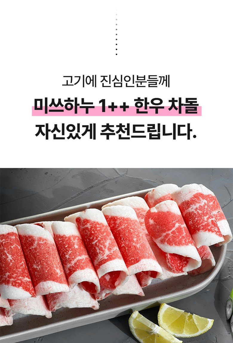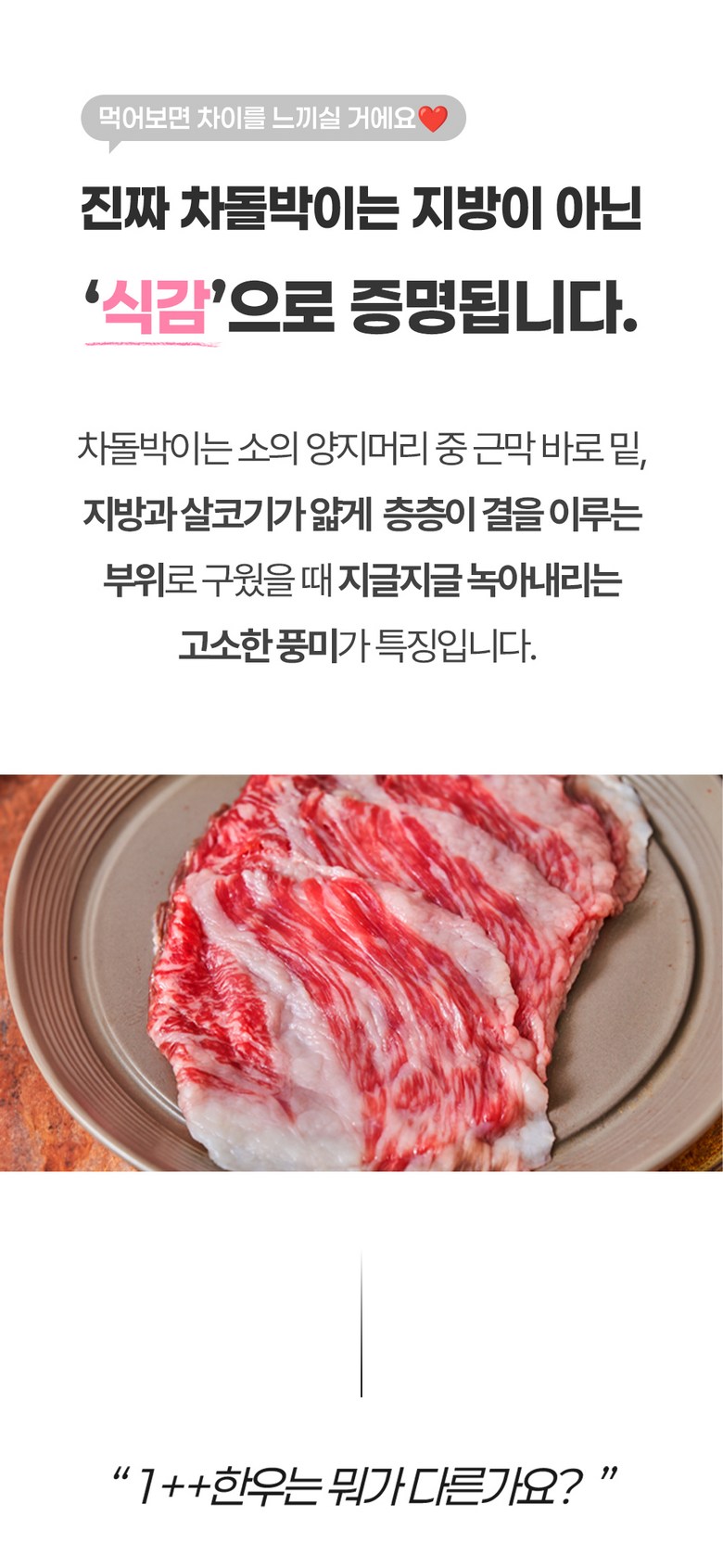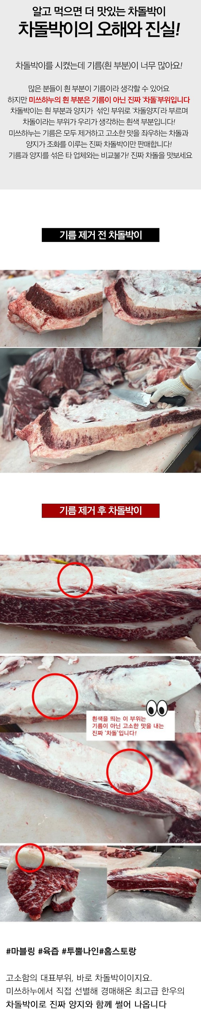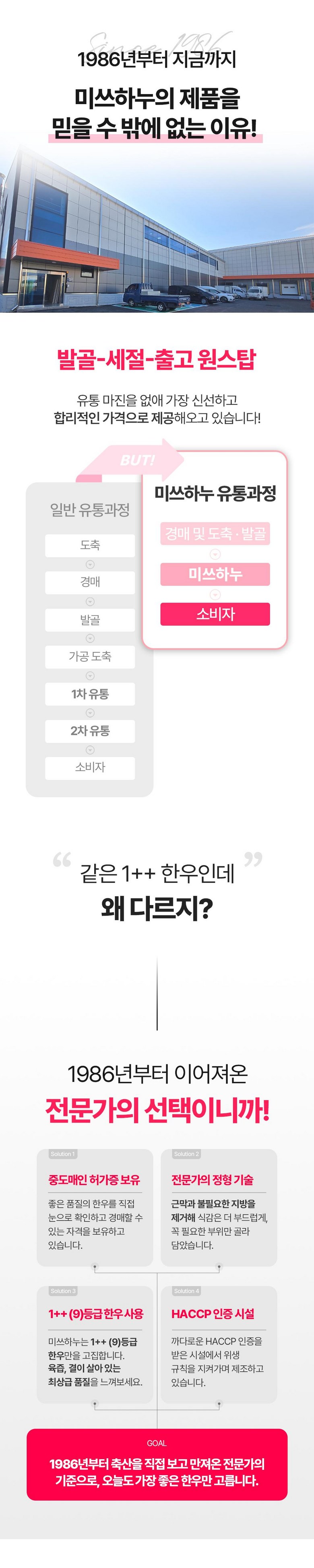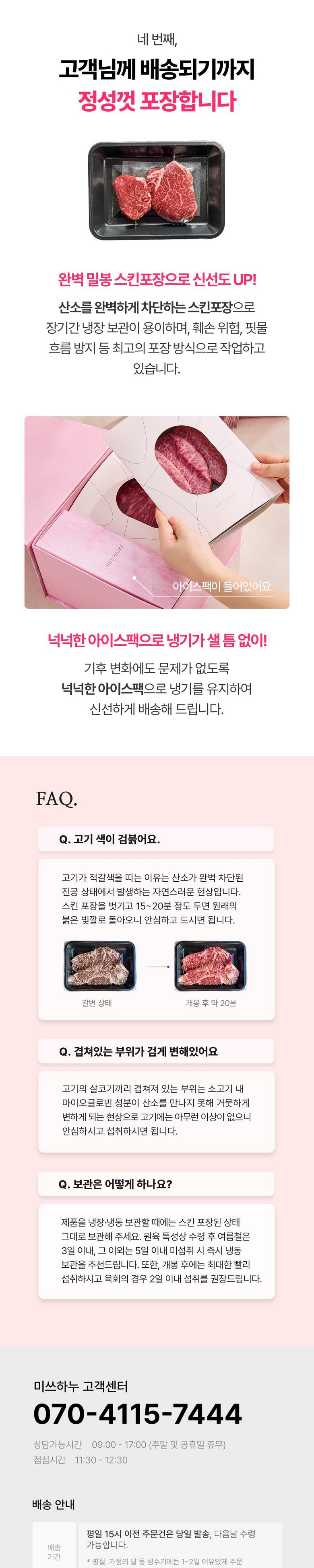 | 제조연월일, 소비기한 또는 품질유지기한 | 제조연월일 : 소비자 주문서 접수일 기준으로 30일 이내 제조된 상품을 판매하며, 자세한 내용은 고객센터(070-4115-7444)를 통해 문의바랍니다. / 소비기한 : 제조일로부터 365일까지 | 세부 품목군별 표시사항 | 1++등급 (근내지방도 (9) (제품별도표기) /축산물이력법에 따른 이력관리표시 유 |