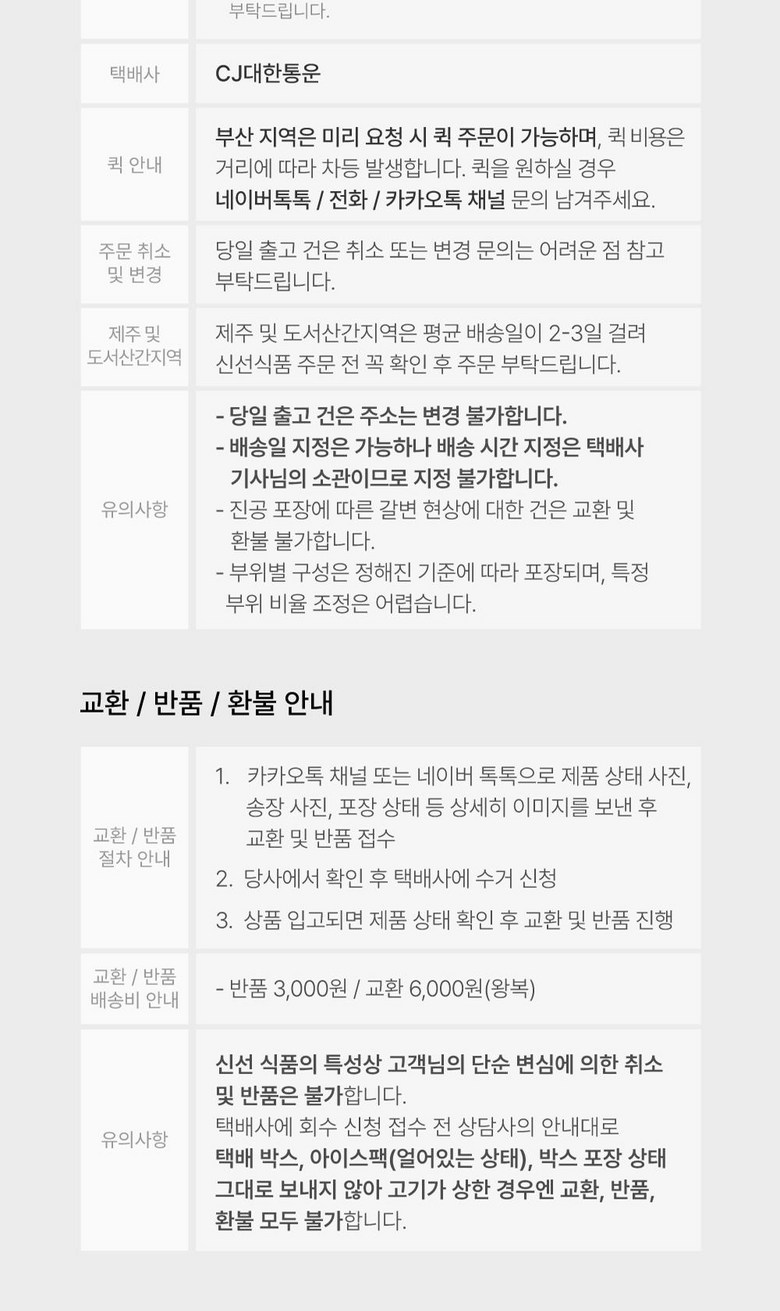 | 배송방법 | 신선/냉장/냉동 | 배송비 | 무료배송 · 도서산간 추가 배송비 - 제주 지역: 5,000원 - 도서산간 지역: 5,000원 |