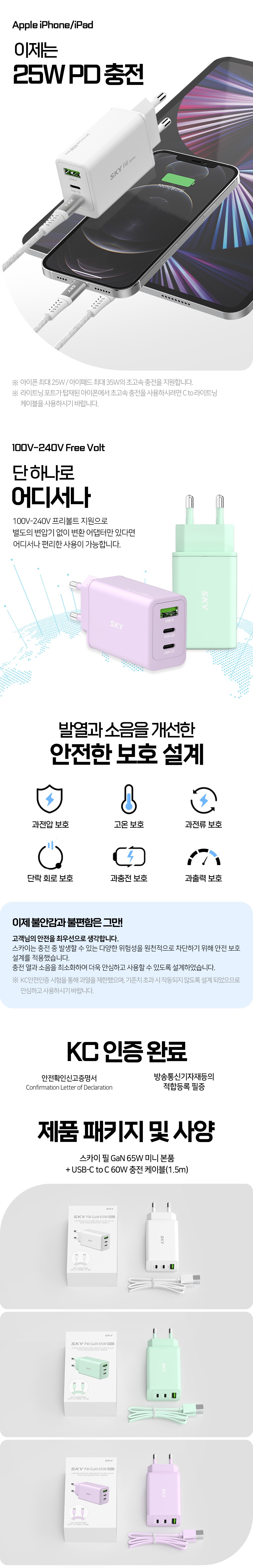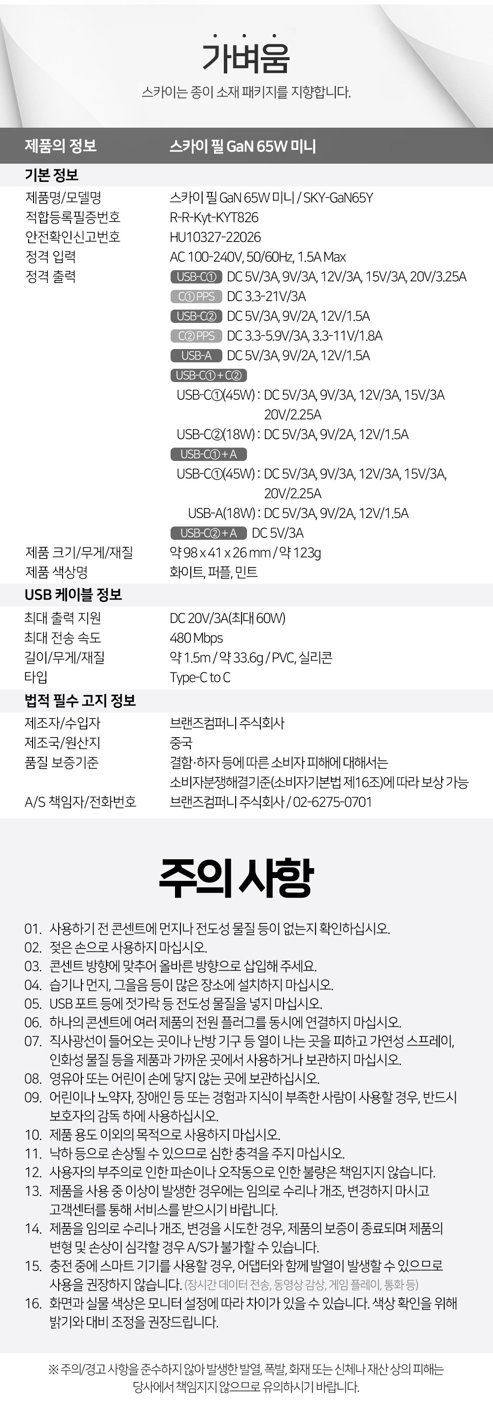 | 품명 및 모델명 | 스카이 필 GaN65W 미니 / SKY-GaN65Y | KC 인증정보 | HU10327-22026C , R-R-Kyt-KYT826 |