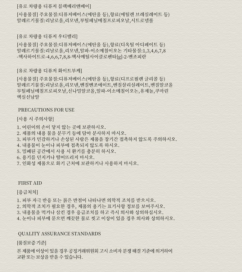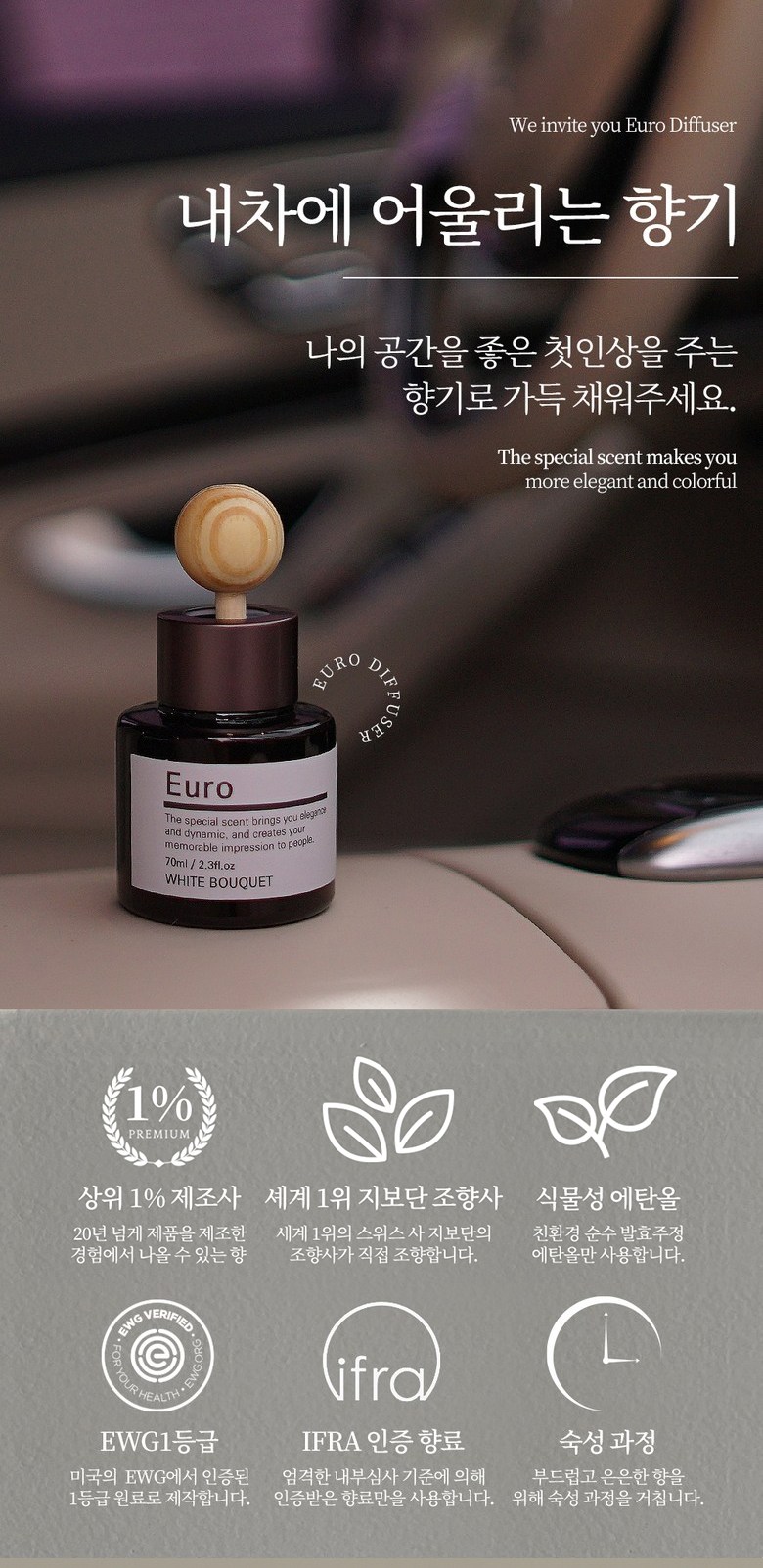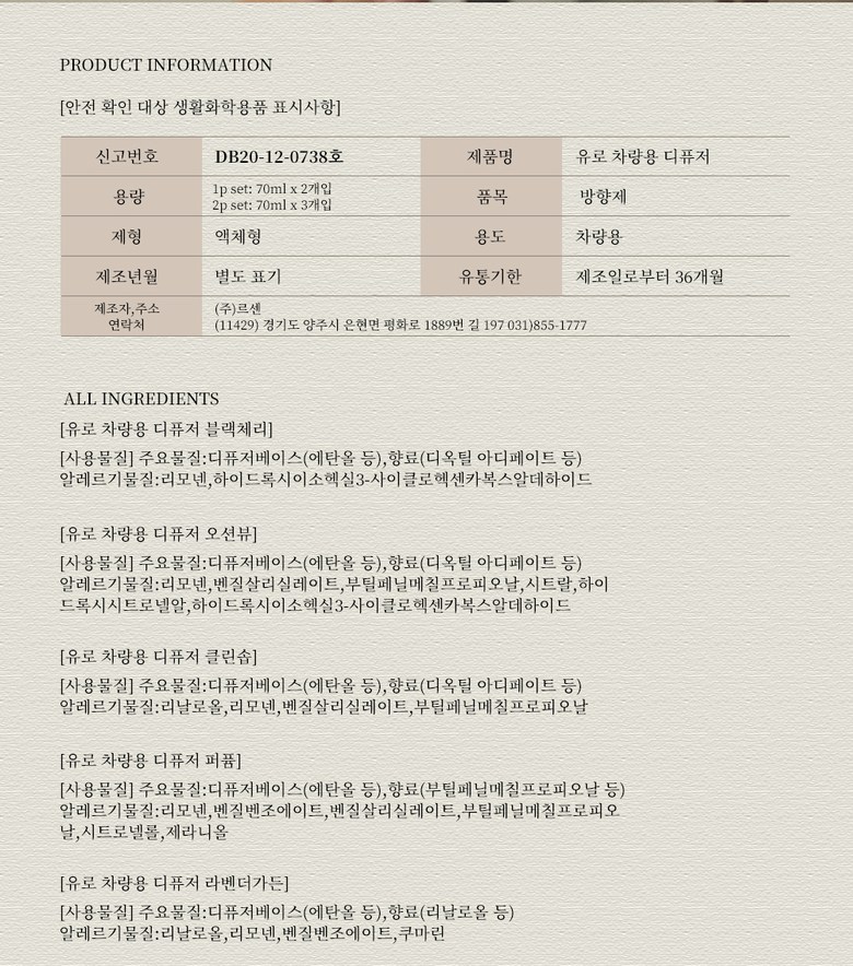 | 품목 및 제품명 | 유로 차량용 디퓨저 | 용도(표백제의 경우 계열을 함께표시) 및 제형 | 자동차용-실내용 |