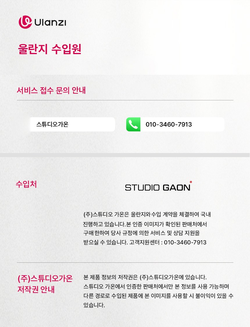 | 제조국(원산지) | 중국 | 제조자(수입자) | Shenzhen Ulanzi Technology Co.,Ltd / THE STUDIO GAON CO., LTD |