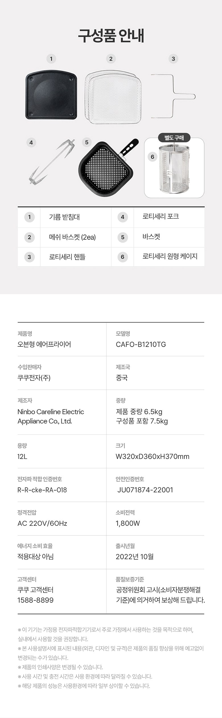 | 품명 및 모델명 | 주방용전열기구와 유사한 기기(에어프라이어) / CAFO-B1210TG | KC 인증정보 | JU071874-22001, R-R-cke-RA-018 |