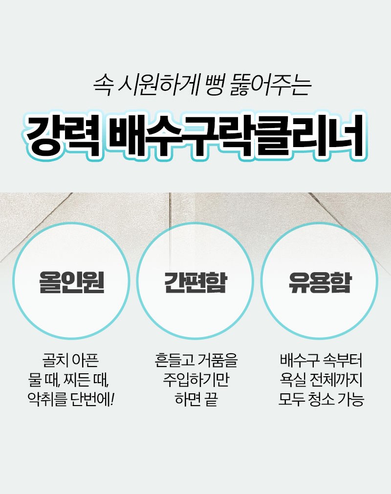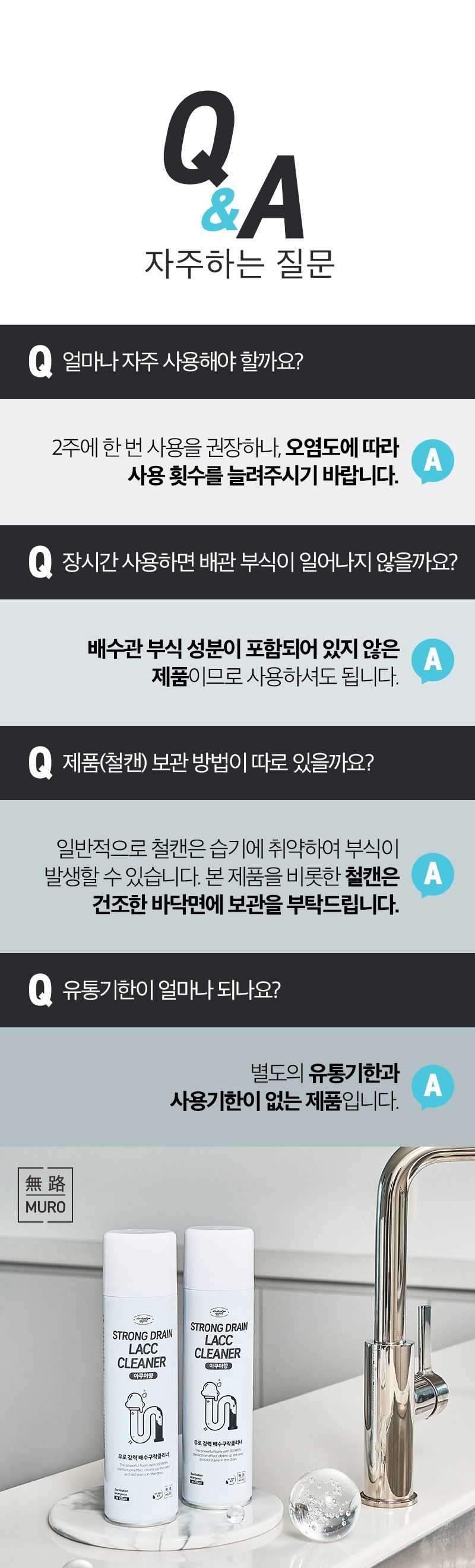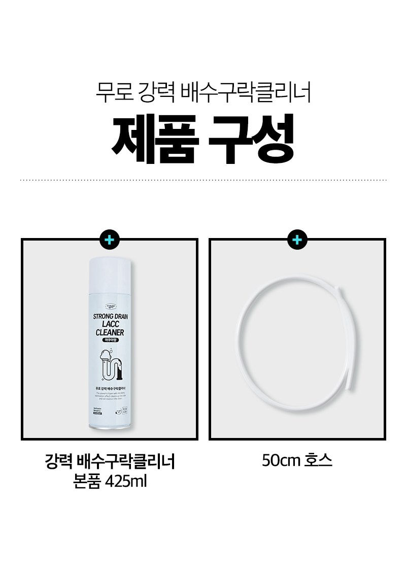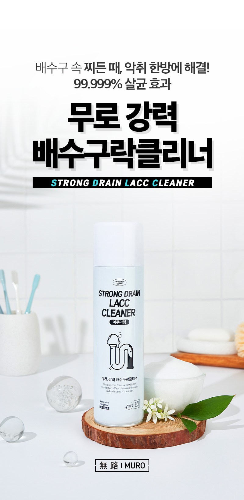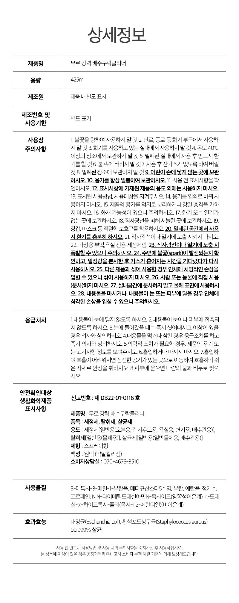 | 품목 및 제품명 | 세정제, 탈취제, 살균제 / 무로 강력 배수구락클리너 + 호스 50cm | 용도(표백제의 경우 계열을 함께표시) 및 제형 | 세정제-일반용(오븐용),일반용(렌지후드용),일반용(욕실용),일반용(변기용),일반용(배수관용) 탈취제-일반용(물체용) 살균제-일반용(일반물체용),일반용(배수관용) / 스프레이형 |