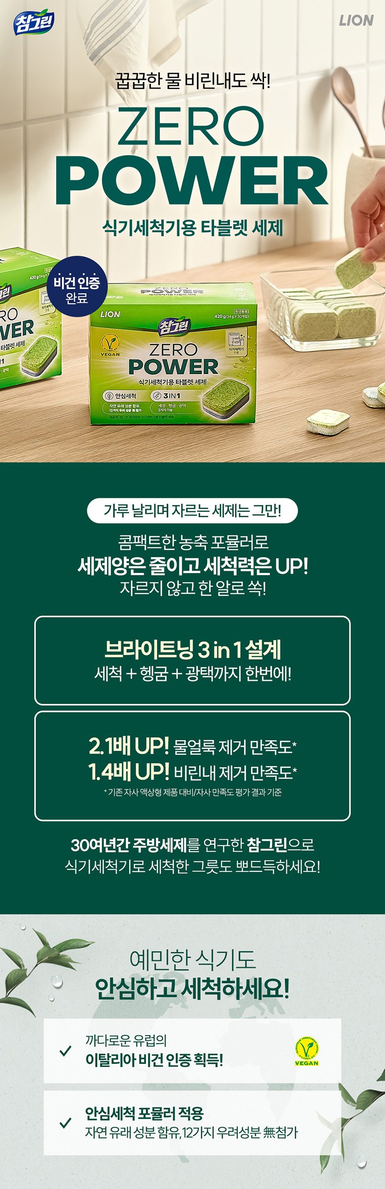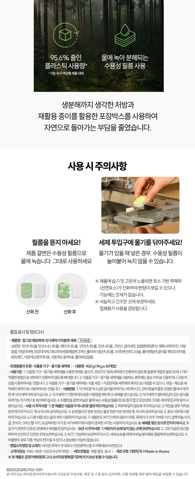 | 품명 및 모델명 | 참그린 제로파워 식기세척기용 타블렛 세제 | 인증/허가 사항 | 위생용품 |