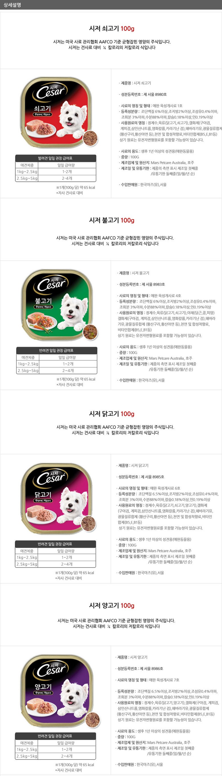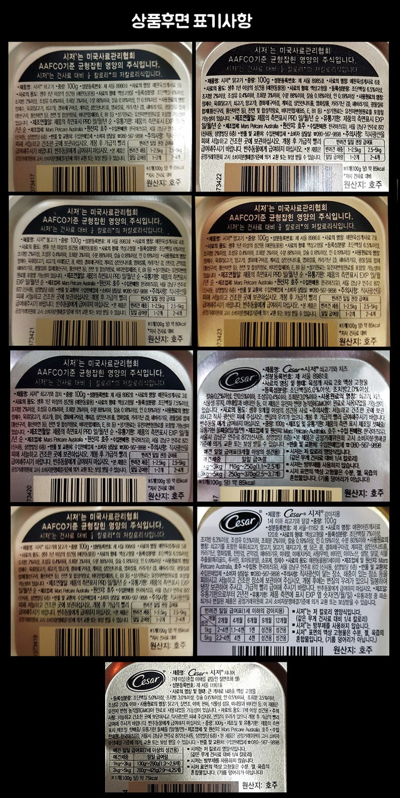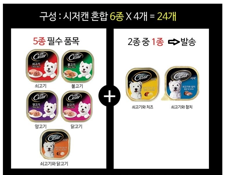 | 품명 및 모델명 | 시저캔100g-쇠고기(4개)닭고기(4개)불고기(4개)양고기(4개)쇠고기와닭고기(4개)+쇠고기와참치or쇠고기와치즈(4개) 혼합24캔 | 인증/허가 사항 | 해당사항없음 |