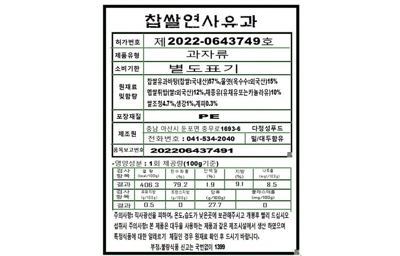 | 제품명 | 찹쌀유과 | 식품의 유형 | 과자류 |