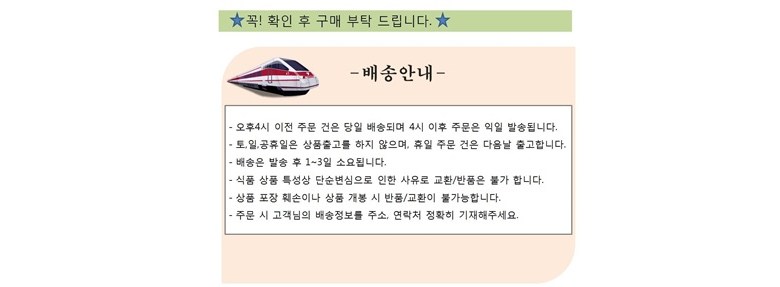 | 배송방법 | 신선/냉장/냉동 | 배송비 | 무료배송 · 도서산간 추가 배송비 - 제주 지역: 8,000원 - 도서산간 지역: 10,000원 |