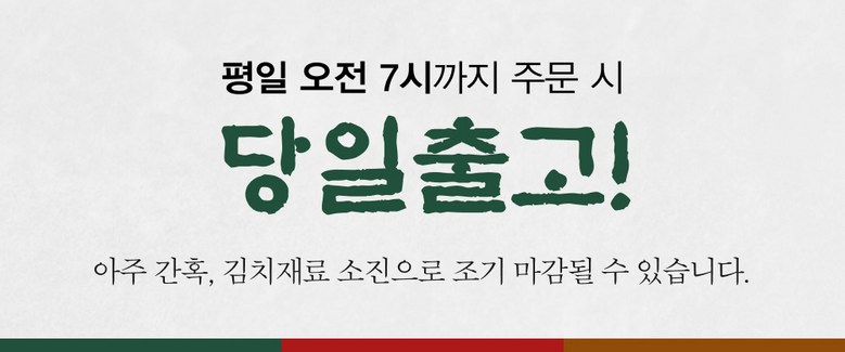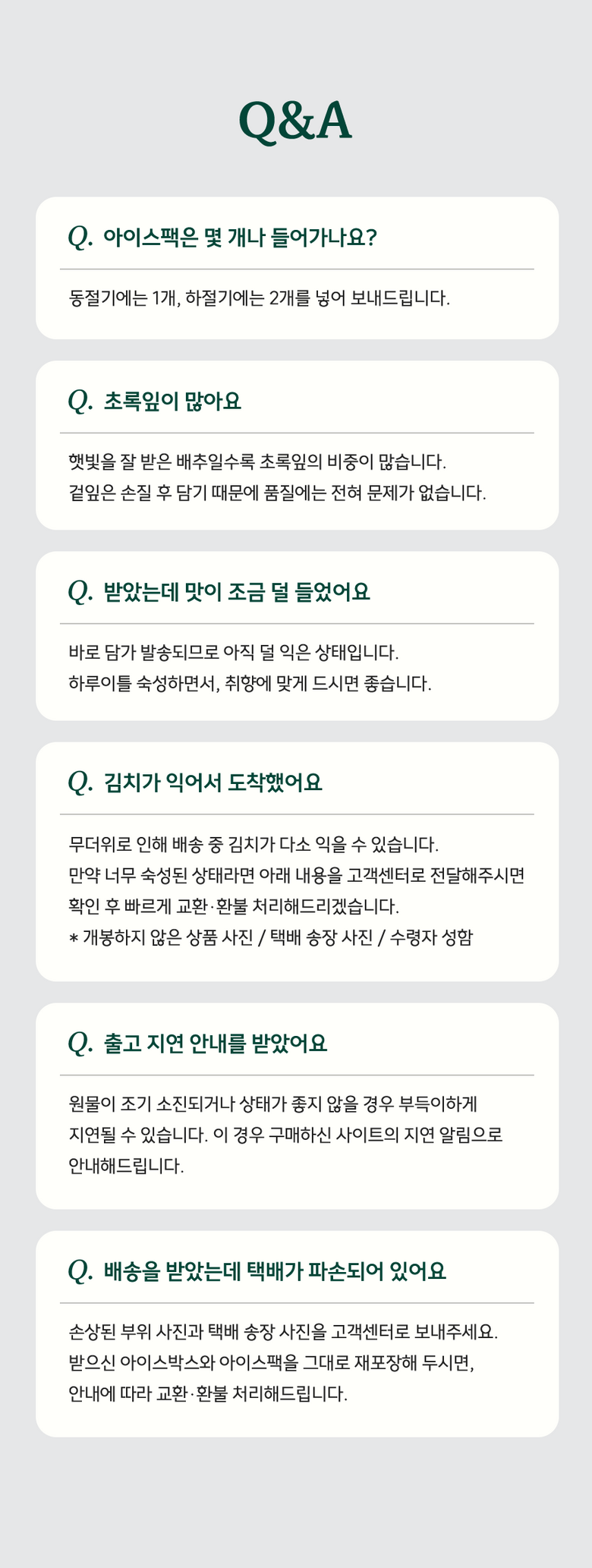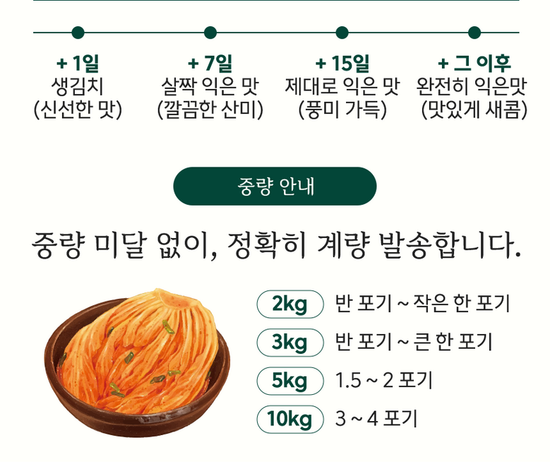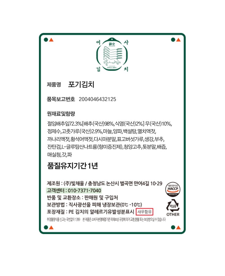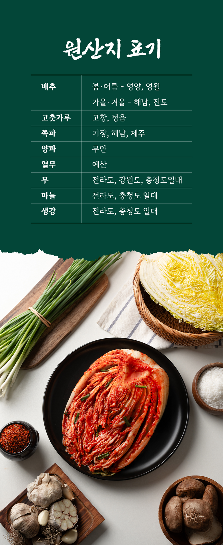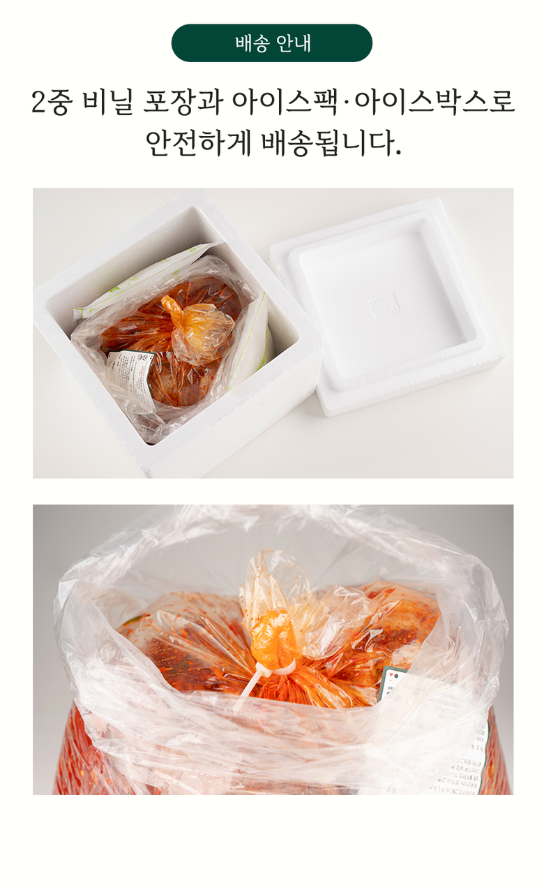 | 포장단위별 내용물의 용량(중량), 수량 | 3kg / 5kg / 10kg | 원재료명 및 함량 | 절임배추잎72.3%[배추(국산)98%,식염(국산)2%]무(국산)10%,정제수,고춧가루(국산)2.9%,마늘,양파,백설탕,멸치액젓,까나리액젓,황석어액젓,다시마분말,표고버섯가루,생강,부추,잔탄검,L-글루탐산나트륨(향미증진제),청양고추,톳분말,배즙,매실청,갓,파 |