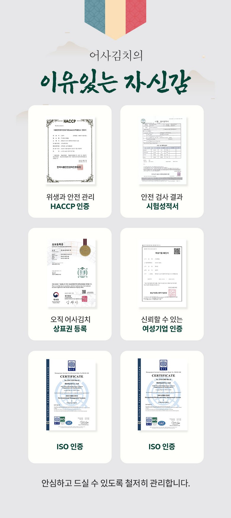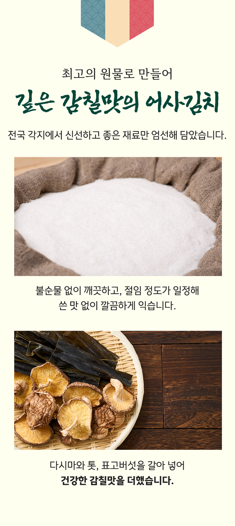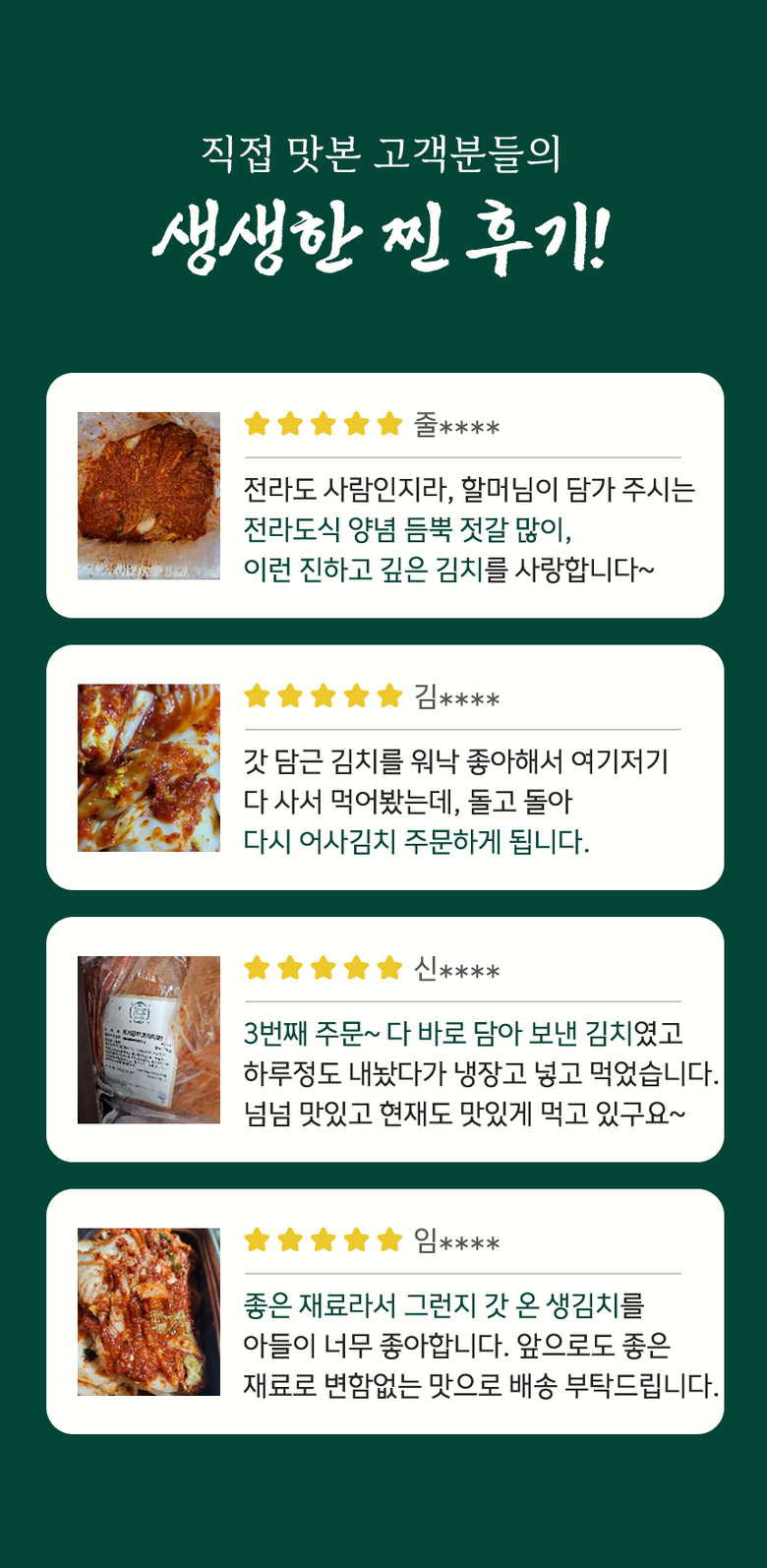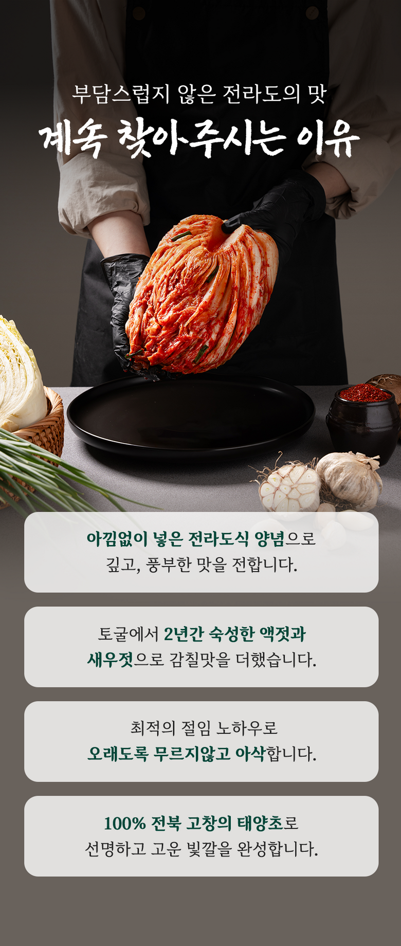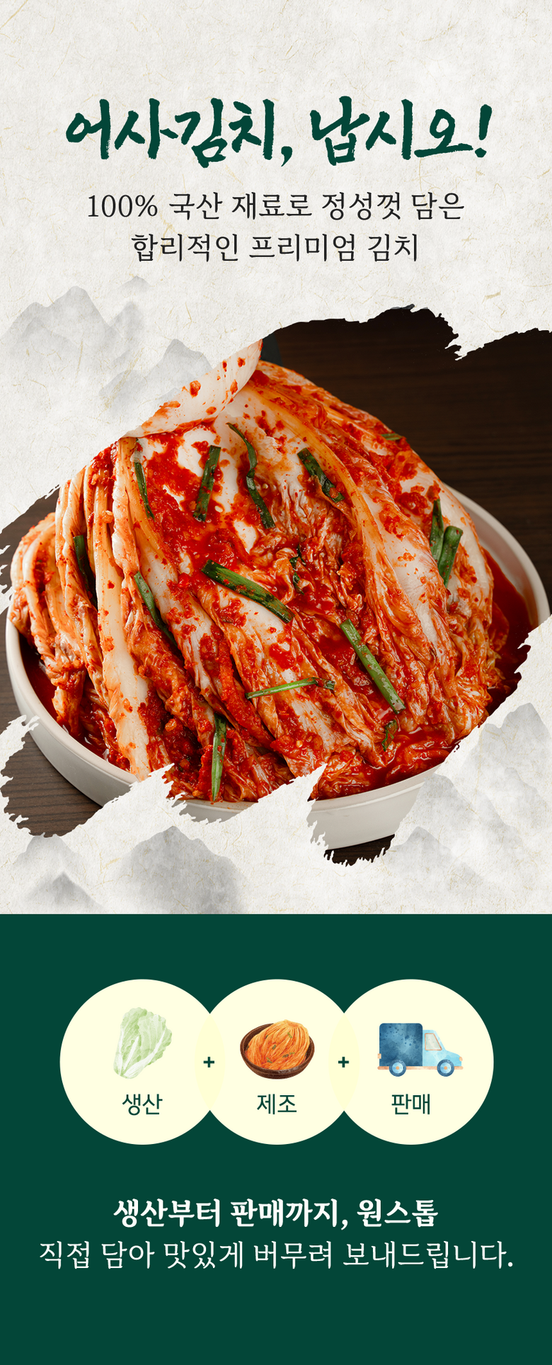 | 포장단위별 내용물의 용량(중량), 수량 | 3kg / 5kg / 10kg | 원재료명 및 함량 | 절임배추잎72.3%[배추(국산)98%,식염(국산)2%]무(국산)10%,정제수,고춧가루(국산)2.9%,마늘,양파,백설탕,멸치액젓,까나리액젓,황석어액젓,다시마분말,표고버섯가루,생강,부추,잔탄검,L-글루탐산나트륨(향미증진제),청양고추,톳분말,배즙,매실청,갓,파 |