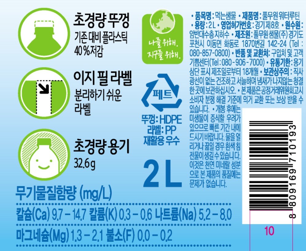 | 제품명 | 풀무원 워터루틴 | 식품의 유형 | 먹는샘물 |