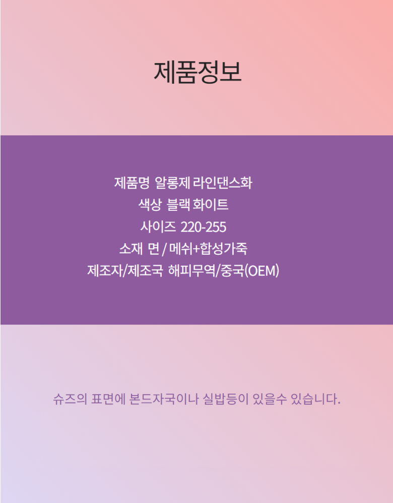 | 치수 | 발길이(mm) : 220~260 / 굽높이(cm) : 굽 2.5센치 | 제조자(수입자) | 컨텐츠 참조 / 알수없음(업체미제공) |