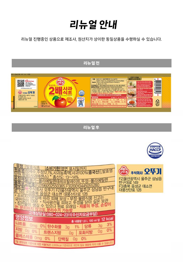 | 제품명 | 2배 사과식초 | 식품의 유형 | 발효식초 |