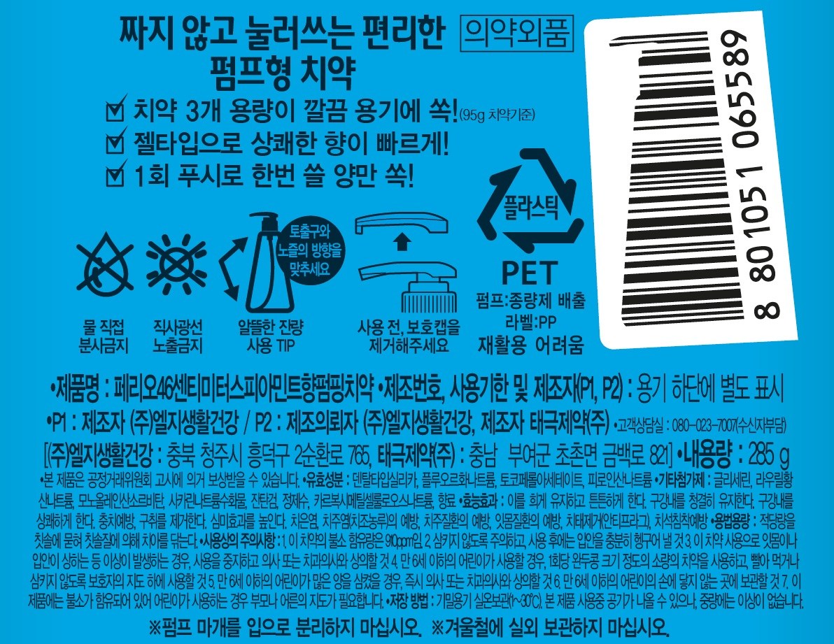 | 품명 및 모델명 | 페리오46센티미터스피아민트향펌핑치약 | 인증/허가 사항 | 의약외품 |