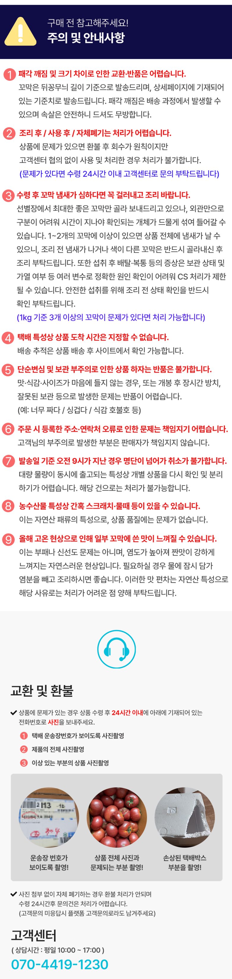 | 계절상품/식품/화장품 | ㆍ신선/냉장/냉동 상품의 단순변심의 경우 ㆍ뷰티 상품 이용 시 트러블(알러지, 붉은 반점, 가려움, 따가움)이 발생하는 경우, |