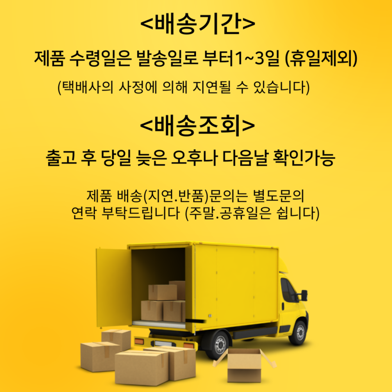 | 배송기간 | ㆍ도서산간 지역 등은 배송에 3-5일이 더 소요될 수 있습니다. - 천재지변, 물량 수급 변동 등 예외적인 사유 발생 시, 다소 지연될 수 있는 점 양해 부탁드립니다. | ||