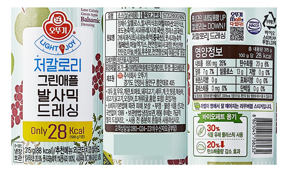 | 제품명 | LIGHT&JOY 그린애플발사믹 저칼로리 드레싱 | 식품의 유형 | 컨텐츠 참조 |