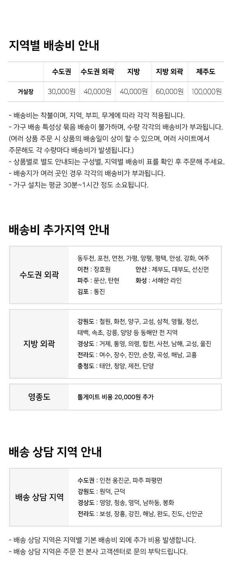 | 배송방법 | 업체직송 | 배송비 | 착불배송(상품별 배송비, 배송가능지역은 상세페이지 참조) - 도서산간 지역 배송불가 |
