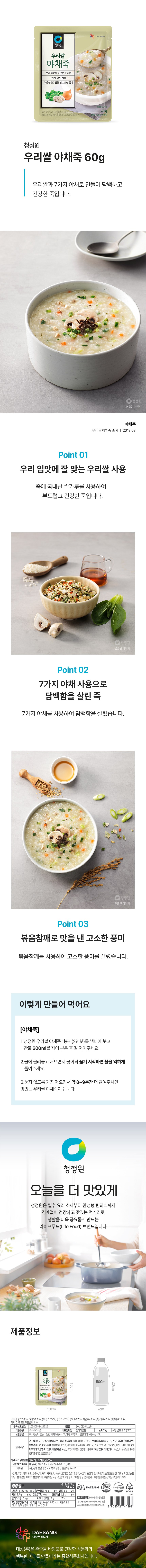 | 제품명 | 청정원우리쌀야채죽 | 식품의 유형 | 컨텐츠 참조 |