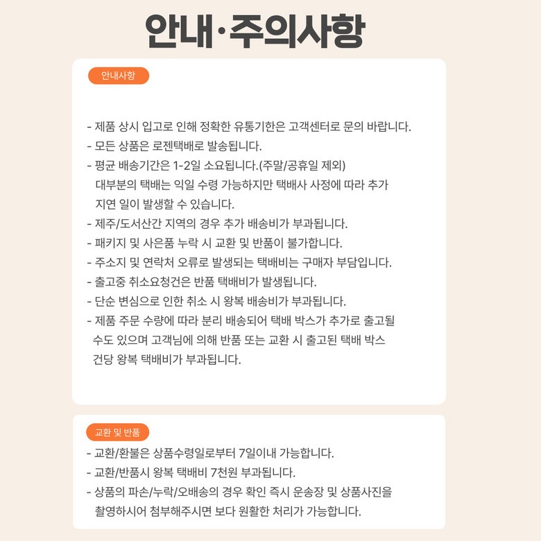 - ㆍ모니터 해상도의 차이로 인해 색상이나 이미지가 실제와 달라, 고객이 단순 변심으로 교환/반품을 무료로 요청하는 경우
