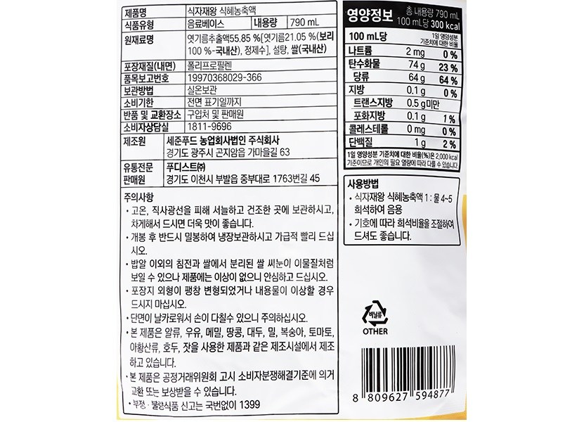 | 포장단위별 내용물의 용량(중량), 수량 | 790ml x 4개 | 원재료명 및 함량 | 컨텐츠 참조 |