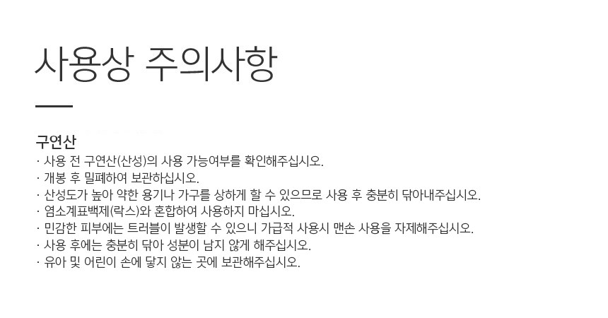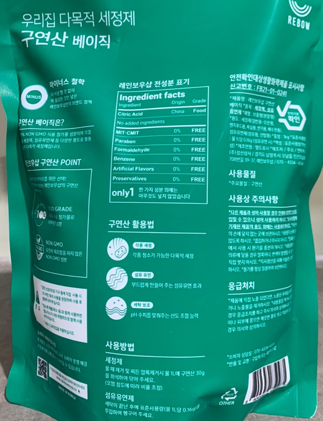 | 품목 및 제품명 | 세정제,섬유유연제/레인보우샵 구연산 베이직 | 용도(표백제의 경우 계열을 함께표시) 및 제형 | 일반용-오븐용,일반용-렌지후드용,일반용-욕실용,일반용-변기용,일반용-배수관용,신발용,섬유용/비분사형-분말형 |