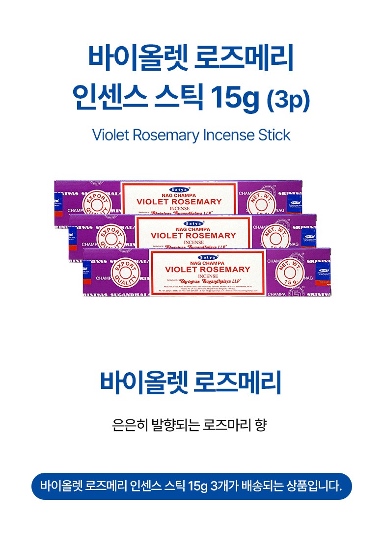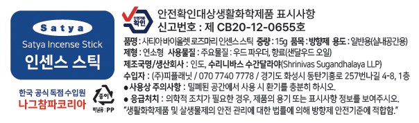 | 품목 및 제품명 | 방향제 / 사티아 바이올렛 로즈마리 인센스 스틱 | 용도(표백제의 경우 계열을 함께표시) 및 제형 | 일반용-실내공간용 / 연소형 |