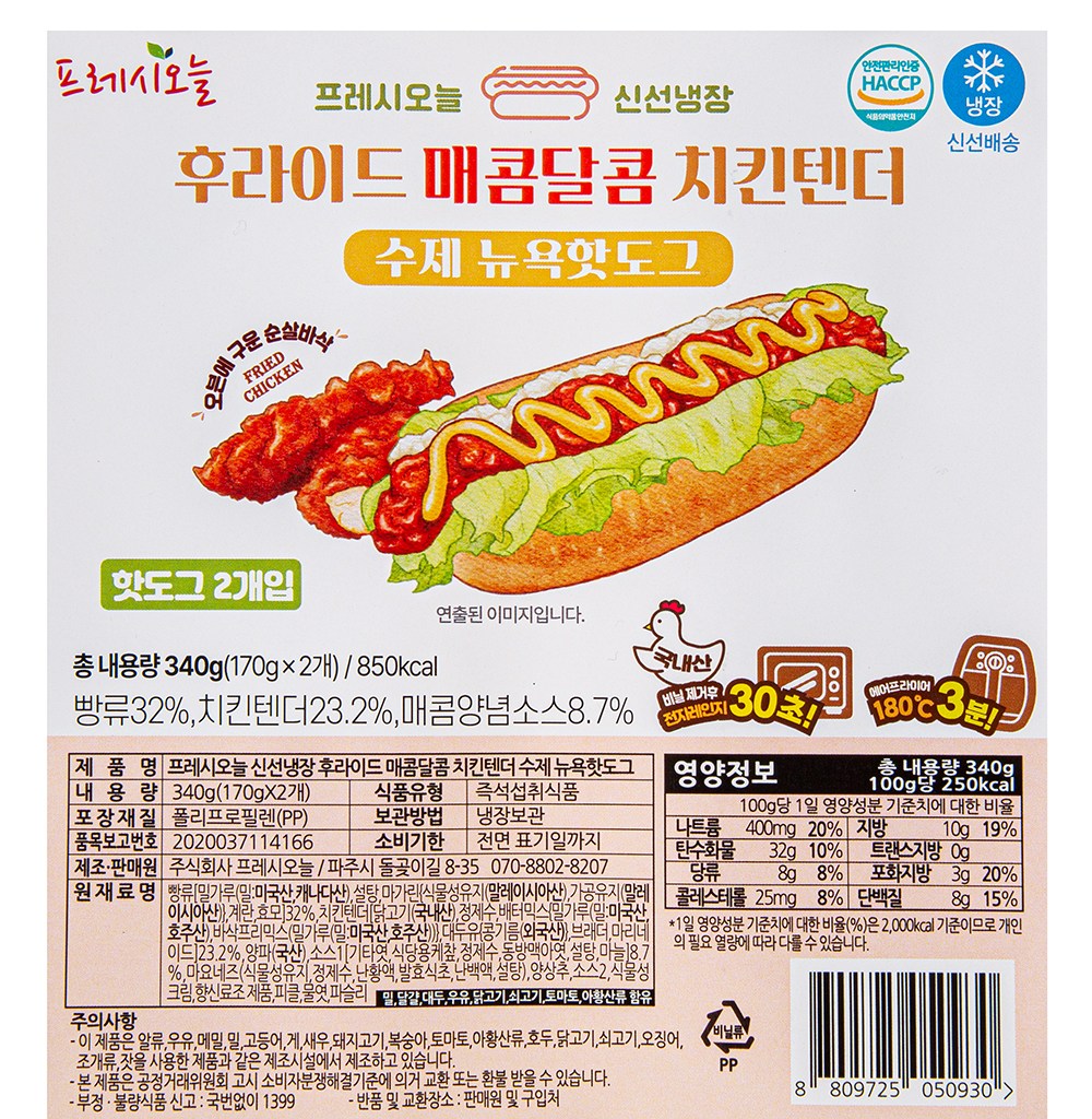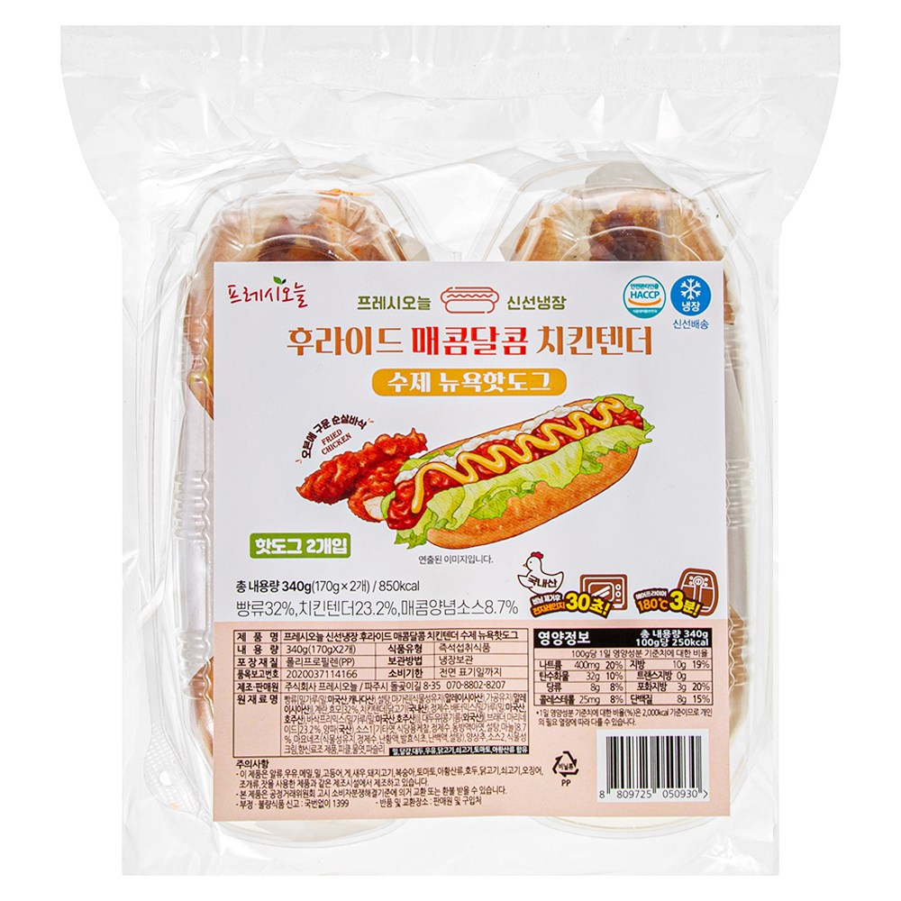 폭신폭신한 빵 속에 바삭한 치킨텐더가 들어간 핫도그예요. 한입 베어 물면 매콤달콤한 소스와 아삭한 양상추의 식감을 느낄 수 있지요. 에어프라이어나 전자레인지로 조리해 간편하게 즐겨보세요.