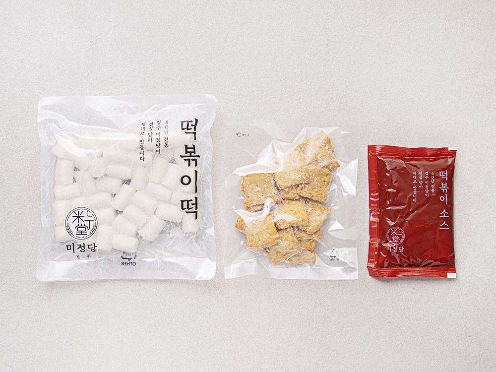 미정당의 떡볶이를 가정에서 즐겨보세요. 냄비에 넣고 끓이기만 하면 뚝딱 완성된답니다. 숟가락으로 국물과 떡, 어묵을 떠 입에 넣으면, 매콤하면서도 달달한 풍미가 입안을 채우지요. 계란, 튀김 등을 준비해 넉넉한 국물에 찍어드셔도 좋아요.
