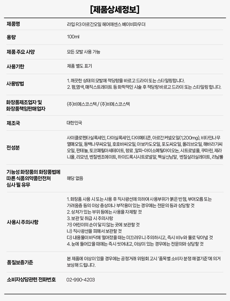 | 용량(중량) | 100ml | 제품 주요 사양 | 모든 모발용 |