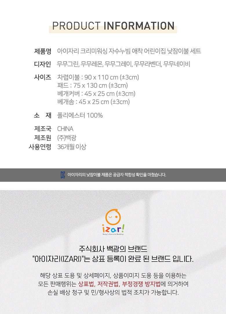 | 품명 및 모델명 | 아이자리 크리미워싱 자수누빔 애착 어린이집 낮잠이불 세트 | KC 인증정보 | 유/KC마크 |