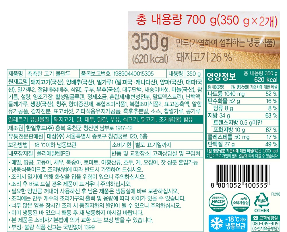 | 포장단위별 내용물의 용량(중량), 수량 | 350g x 2개 | 원재료명 및 함량 | 컨텐츠 참조 |