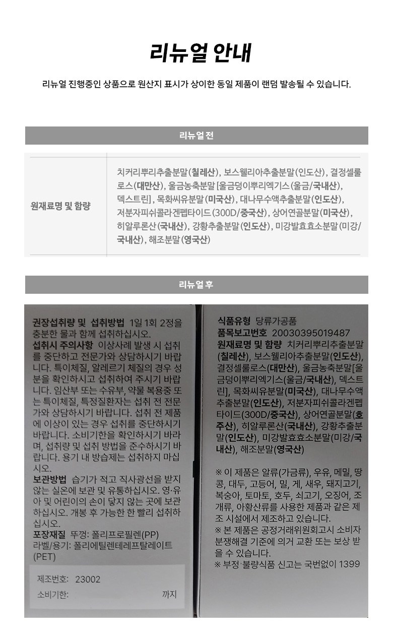 | 생산자 및 소재지 | 컨텐츠 참조 | 제조연월일, 소비기한 또는 품질유지기한 | 업데이트 예정 |