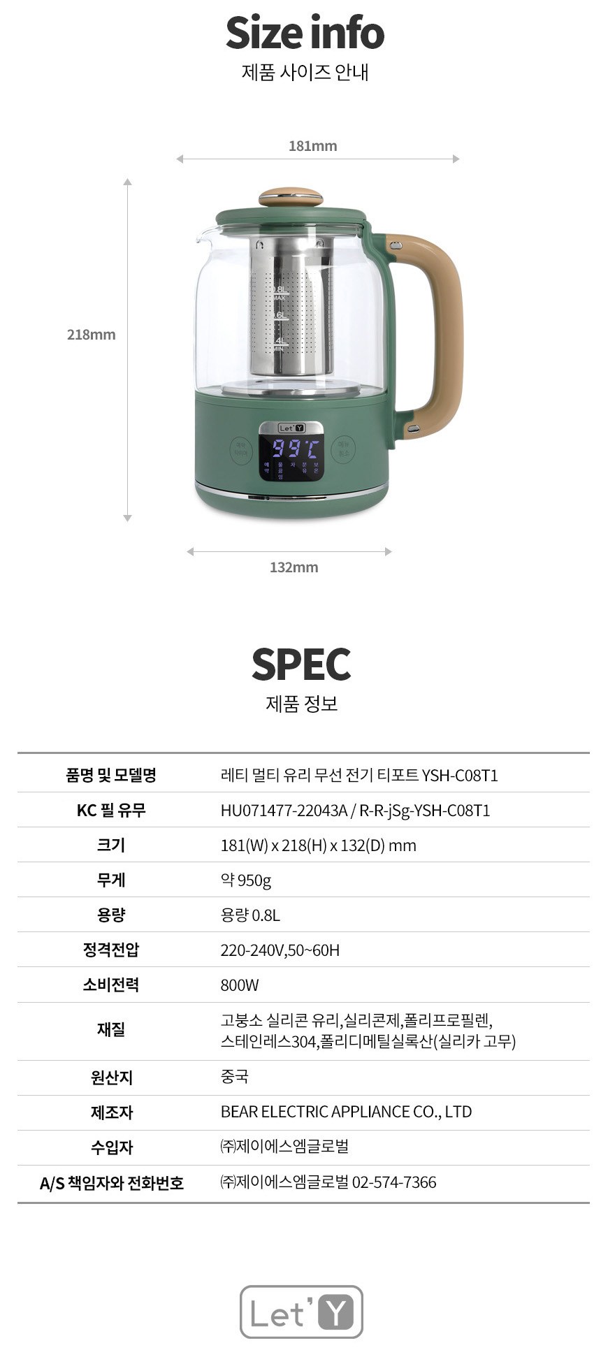 | 품명 및 모델명 | 레티 글라스 티포트, YSH-C08T1 | KC 인증정보 | HU071477-22043A, R-R-jSg-YSH-C08T1 |
