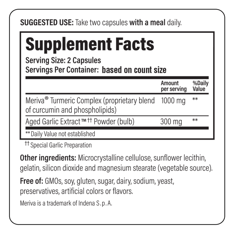 숙성 마늘 추출물과 커큐민으로 만든 식이 보충제입니다. 건강한 염증 반응과 관절 기능, 결장 및 간 건강 등에 도움을 줄 수 있습니다. 냄새가 나지 않으며 위에도 부담 없이 섭취할 수 있습니다.
