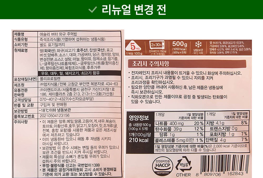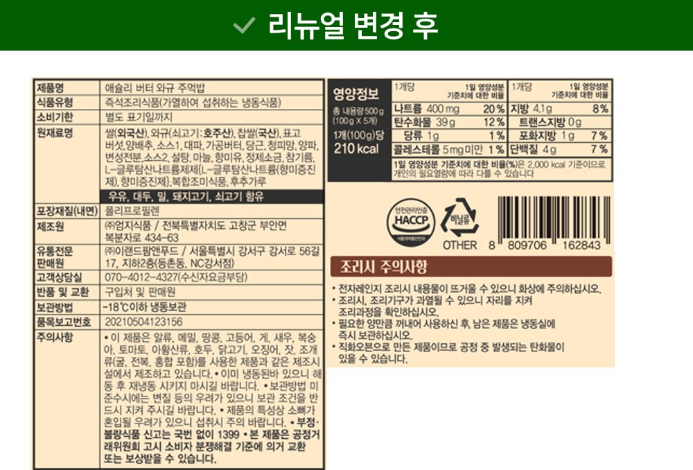 | 포장단위별 내용물의 용량(중량), 수량 | 500g , 6개 | 원재료명 및 함량 | 컨텐츠 참조 |
