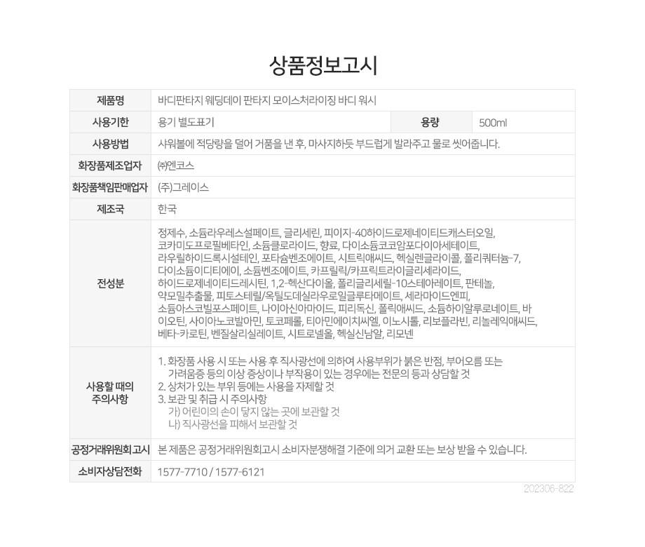 | 용량(중량) | 500ml | 제품 주요 사양 | 모든 피부용 |