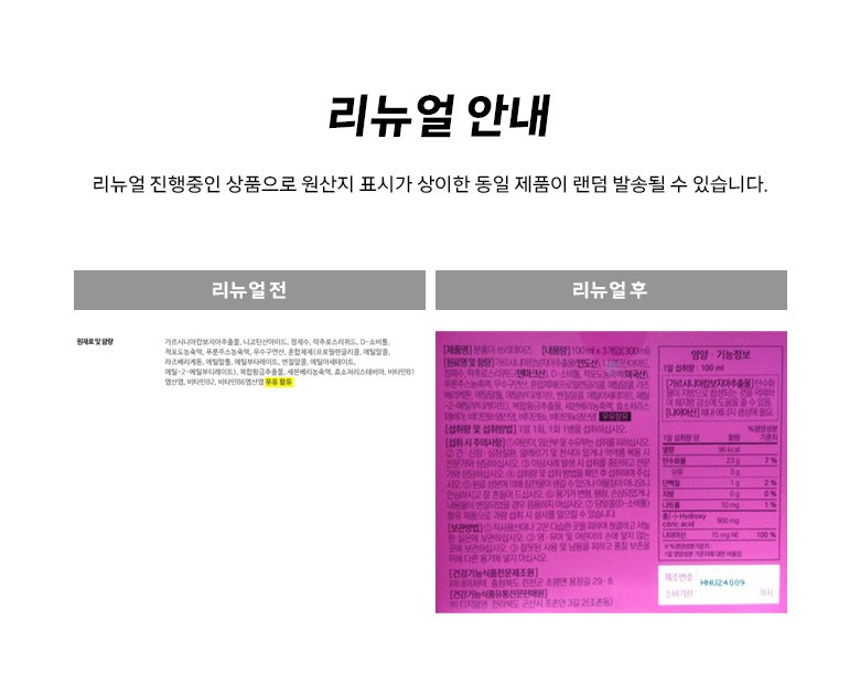 | 원료명 및 함량 | 컨텐츠 참조 | 영양정보 | 컨텐츠 참조 |