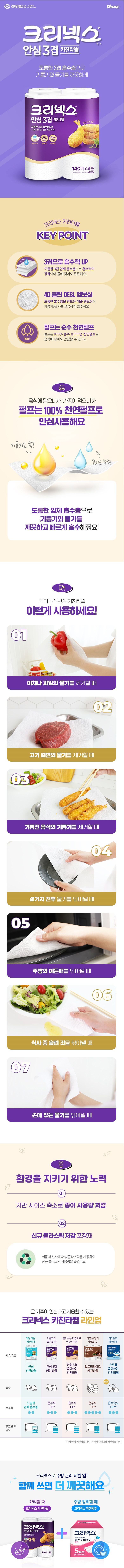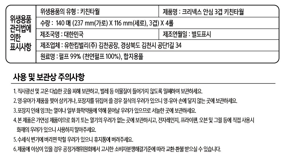 | 품명 및 모델명 | 크리넥스 안심 3겹 키친타월 | 인증/허가 사항 | 위생용품 |