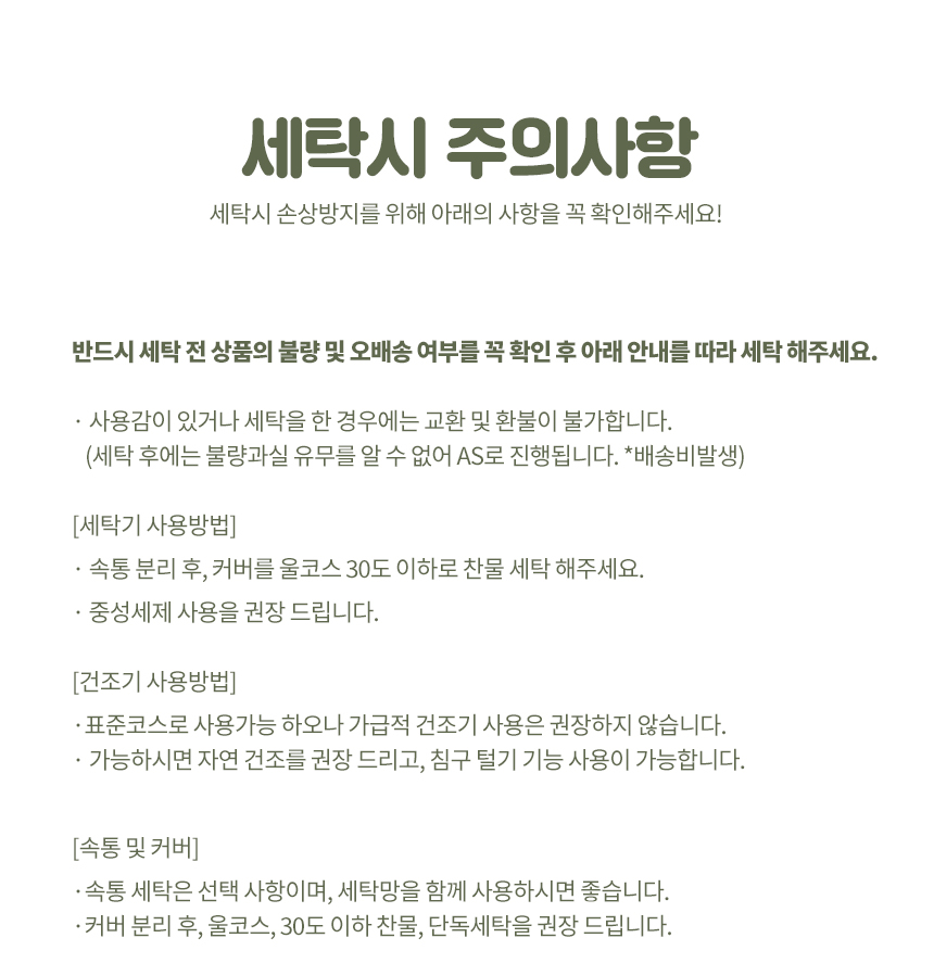 - ㆍ모니터 해상도의 차이로 인해 색상이나 이미지가 실제와 달라, 고객이 단순 변심으로 교환/반품을 무료로 요청하는 경우