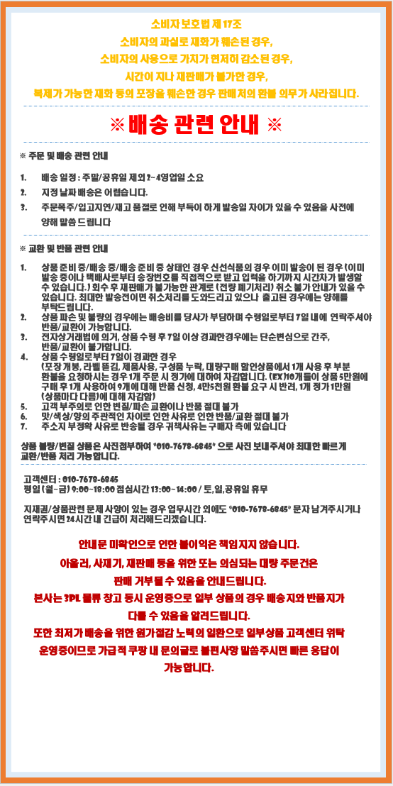 - ㆍ교환/반품에 관한 일반적인 사항은 판매자가 제시사항보다 관계법령이 우선합니다.