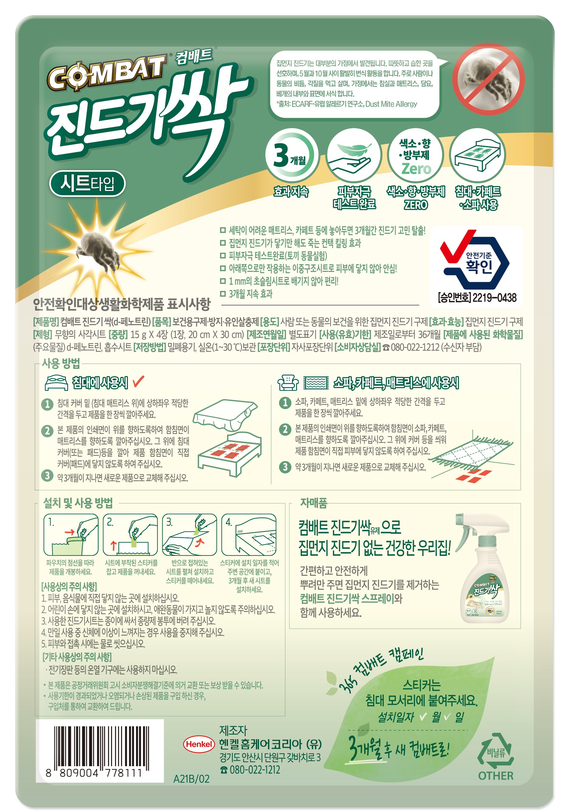 | 품목 및 제품명 | 보건용 구제·방지·유인살충제 / 컴배트진드기싹(d-페노트린) | 용도(표백제의 경우 계열을 함께표시) 및 제형 | 사람 또는 동물의 보건을 위한 집먼지 진드기 구제 / 무향의 사각시트 |