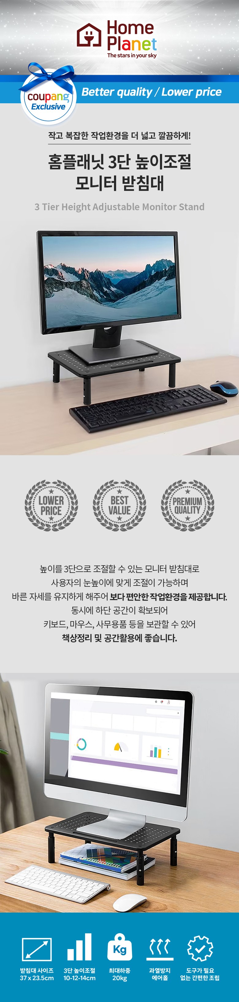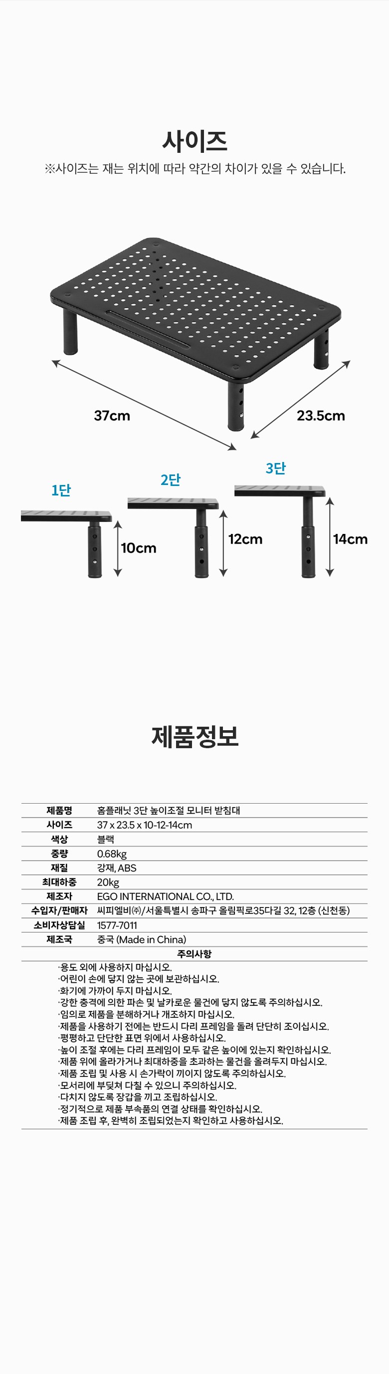 | 품명 | 홈플래닛 3단 높이조절 모니터 받침대 | KC 인증정보 | 해당없음 |